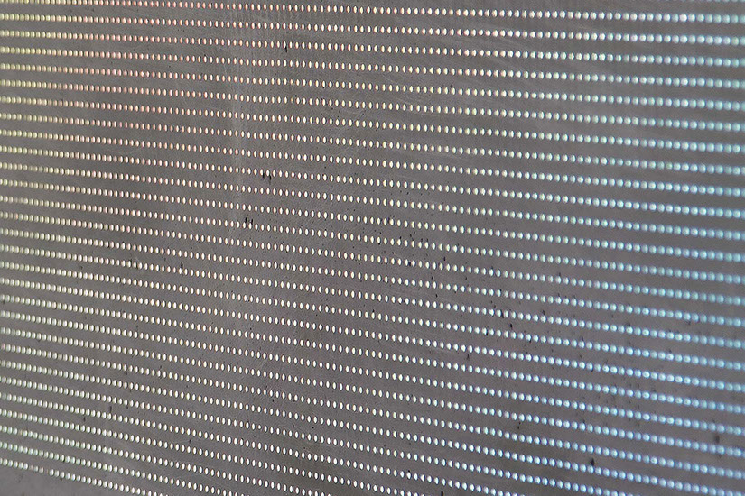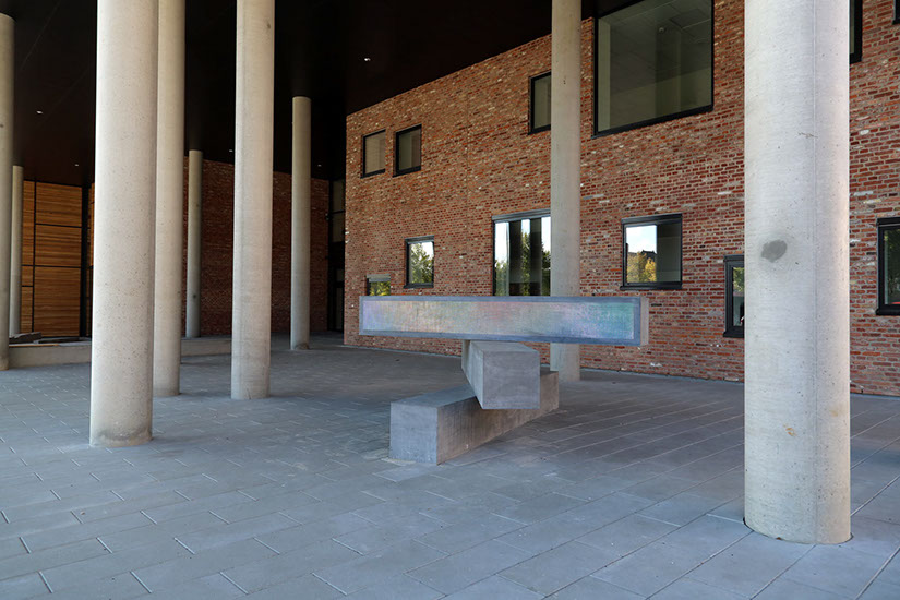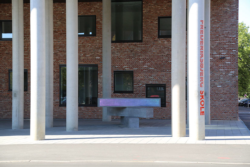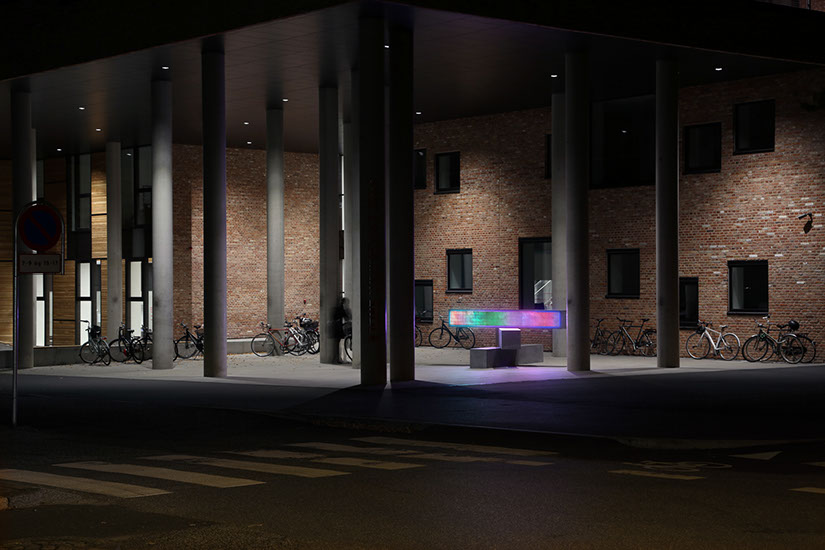 The luminous surface of the uppermost plinth includes 9216 clear, conical pieces of acrylic. Inside the plinth, an LED screen has been made with a corresponding number of diode lights to illuminate the pieces of acrylic and shine light outward from the concrete. The luminous plinth runs a video animation which brings colour, light, and movement to the school’s entry space. The video animation takes its point of departure in a blow-up of pixels in the colours of the spectrum, and it alters appearance using a slow sequence whereby the colours mix and transform in a stream of movement.