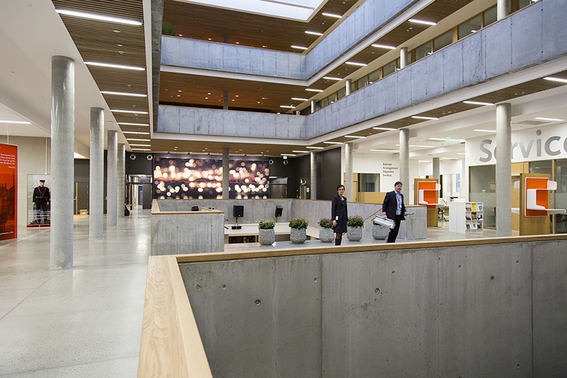 Structurally, the Town Hall Quarter employs a glass-ceilinged atrium over a deep, open space with municipal offices occupying its perimeters. The central space is open and it spans four stories up to the glass ceiling, which allows daylight to filter in.