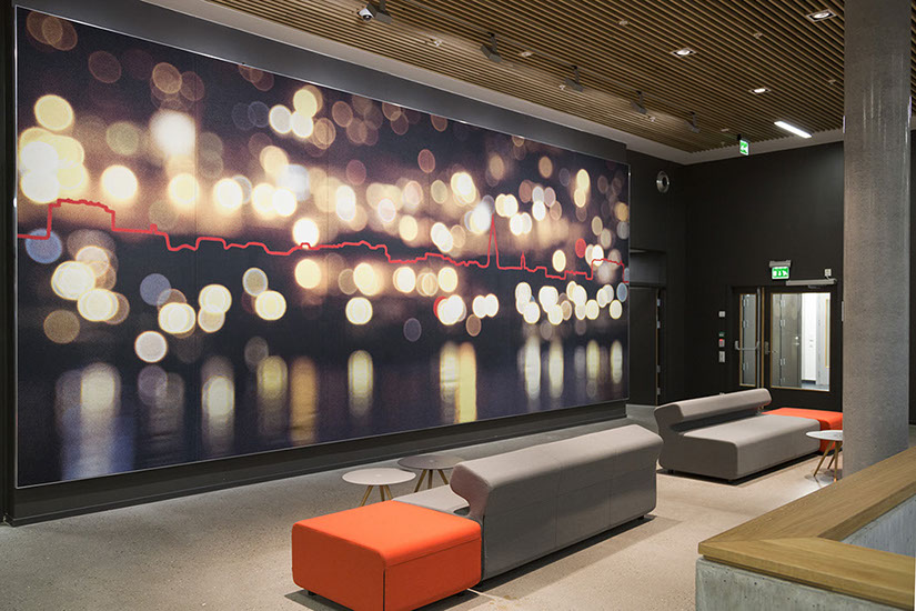 The significant end wall of the floorplan was envisaged as a site for a largescale textile artwork. The project sought a woven tapestry with a motif capable of presenting modern-day Kristiansand in a contemporary, abstract visual idiom.