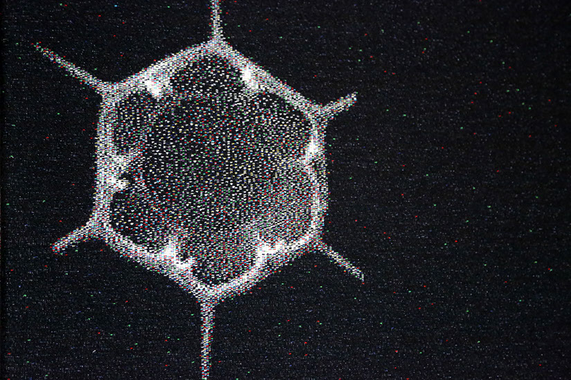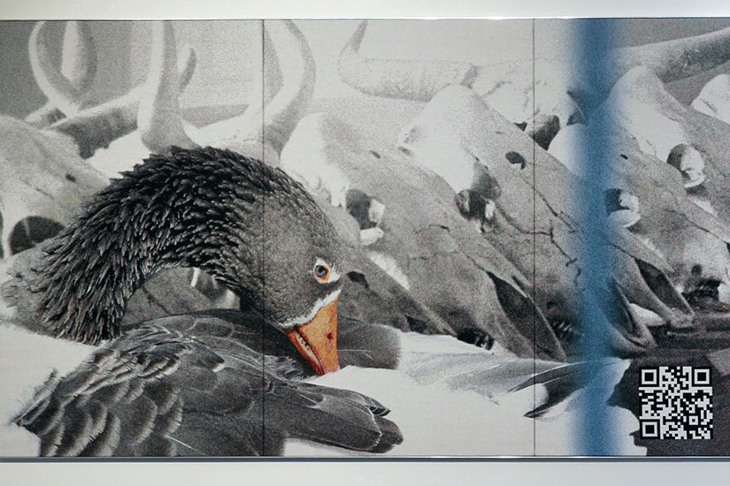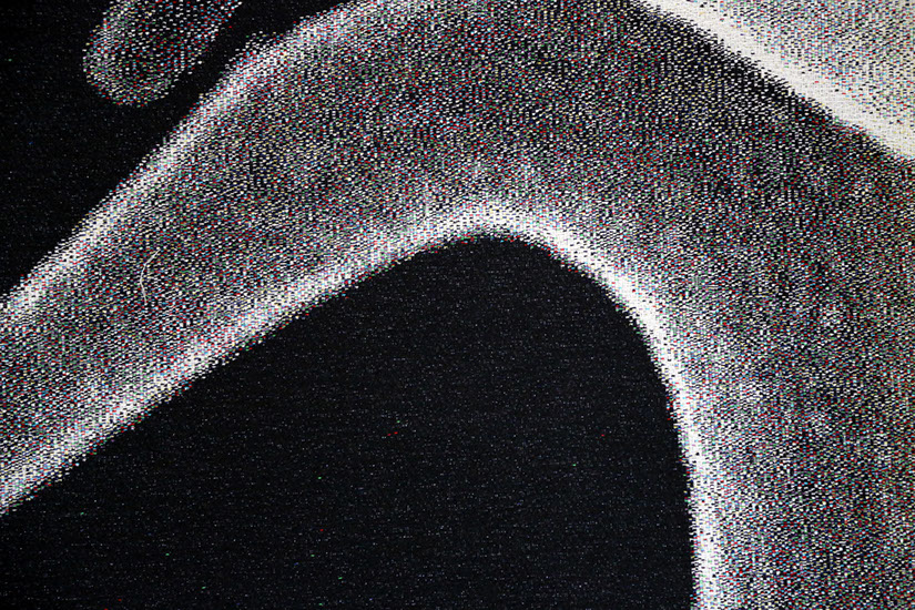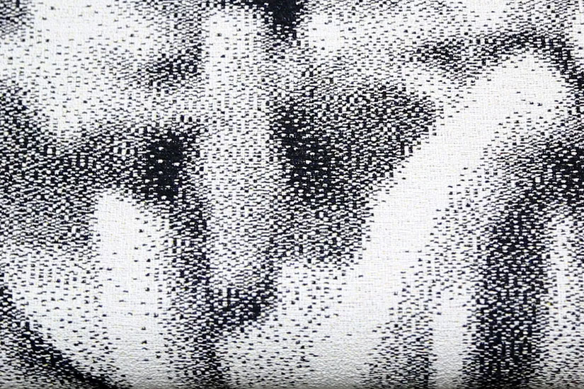 The friezes are composed as collages and this gives the artist freedom to mix and combine different motifs in ways not bound by their literal, real-world modes of connection. Grethe Sørensen’s friezes have also incorporated elements from architecture in a finely-tuned way. The colour stripes in the weavings correspond with rafters in the roof. The stripes create soft transitions in the compositions and they embed the works in the spaces for which they have been created. The four incorporated QR codes are a salient feature. They feature as a recognisable element brought in from our digital everyday life and they stand out from the rest of the composition. The square shapes mirror the original ornaments on the walls but are not merely designed as ornaments. Behind each code is information about the work and processes. In this way, they open the door to an underlying dimension of the visual experience itself.