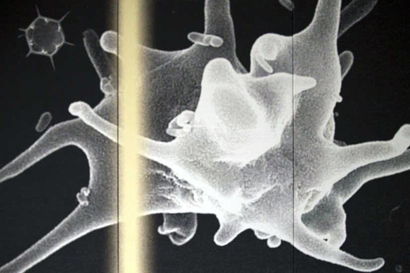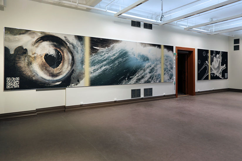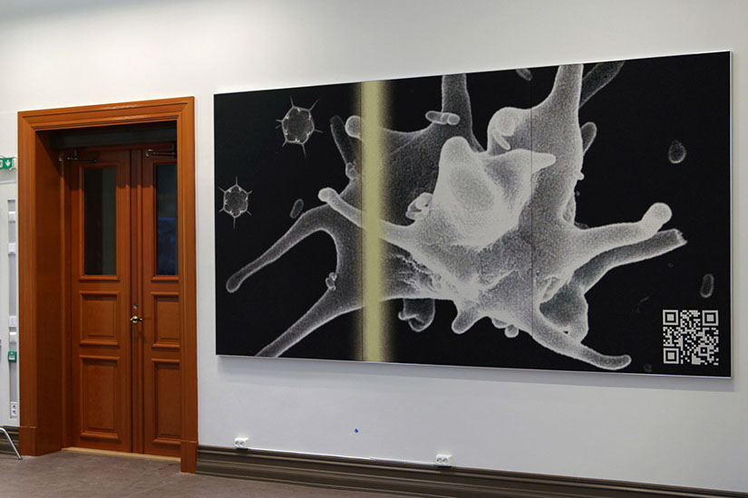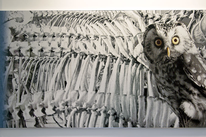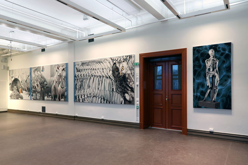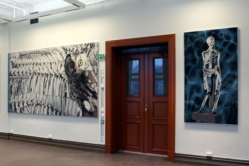 Danish textile artist Grethe Sørensen has extensive experience with textile projects for the public sector. Her work builds on the European Gobelin and tapestry tradition which she interprets through contemporary digital weaving technology and production. Grethe Sørensen has created large jacquard-woven friezes in a light and neutral colour scheme. All motifs are derived from images in the archives of The Norwegian University of Life Sciences (NMBU), and the titles concretely describe which aspects of nature the artist has selected. At the heart of her project is a dynamic interplay between past and present, between textiles then and now, and between the history of architecture and contemporary learning activities. Not least, she thematises the relationship between humans and animals. It is an invitation to deeper reflection on the span between the enormous forces of nature, such as ocean waves, and nature’s smaller creatures, such as butterflies. Grethe Sørensen has gathered elements at micro and macro levels and created equality between greater and smaller elements such as amoebae, enzymes, goats and geese. A fish’s eye, monumental and fixed, looks straight at us and is placed next to a dramatic ocean wave. Large skeleton collections are set in contrast with an owl. The serious but calm gaze of the bird touches us, it really sees, as if both it and the fish eye become a connection to the enormous environmental challenges we face.