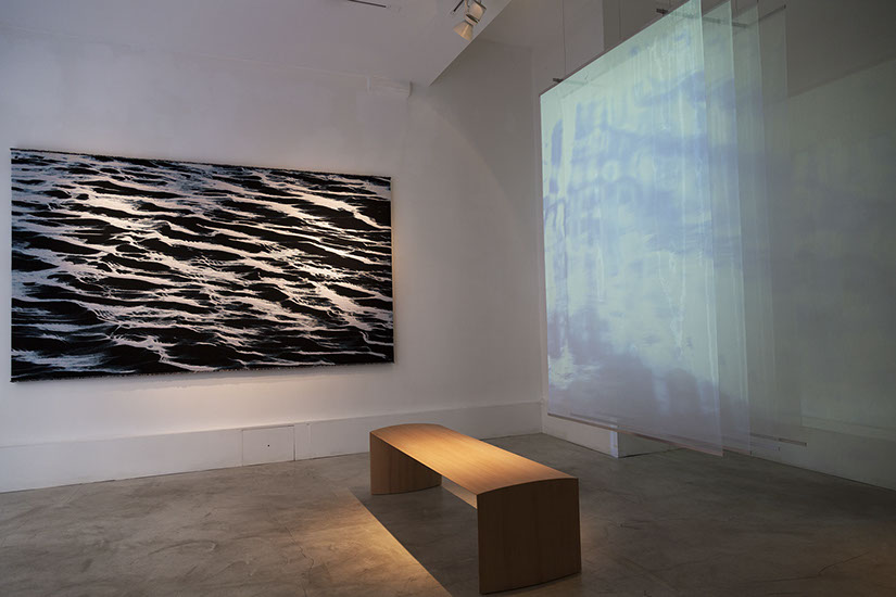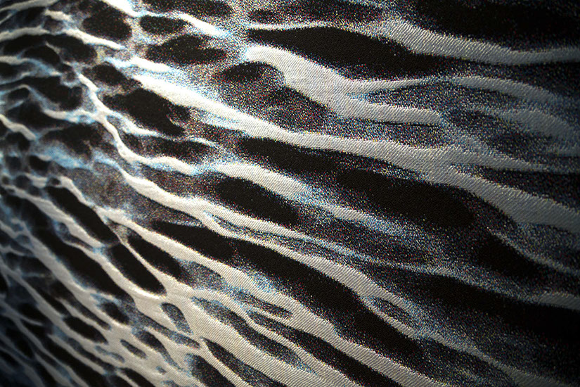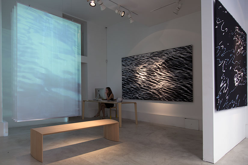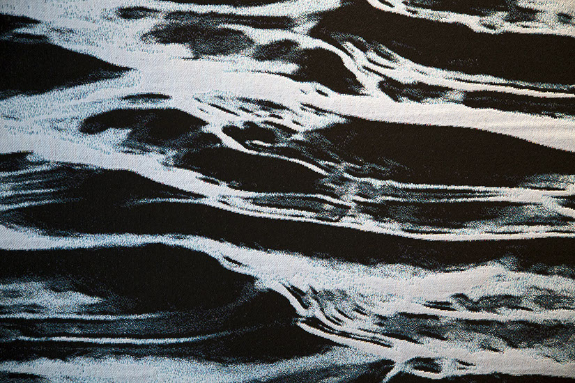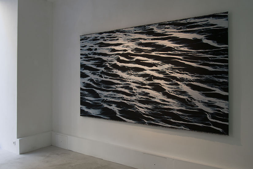 In 2016 in Paris, Galerie Maria Wettergren presented the exhibition Water Mirror by Grethe Sørensen, showing five large wall tapestries and a multimedia video installation. This new eponymous series of Jacquard tapestries is inspired by light reflections off water as observed by the artist in the Venice canals, Tokyo Bay and Danish waters.